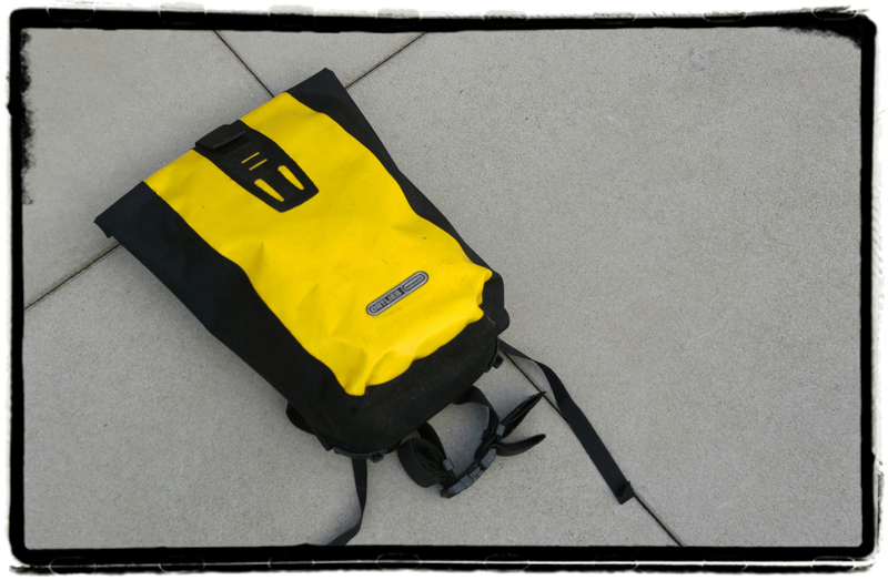 M’n ouwe rugzak was allesbehalve waterdicht, wat vervelend is als je een uur door de regen moet. De regenbestendige vervanger werd de Ortlieb Velocity. Niet specifiek een motorrugzak, maar gezien de reputatie van Ortlieb lijkt dit me geen slechte keuze.