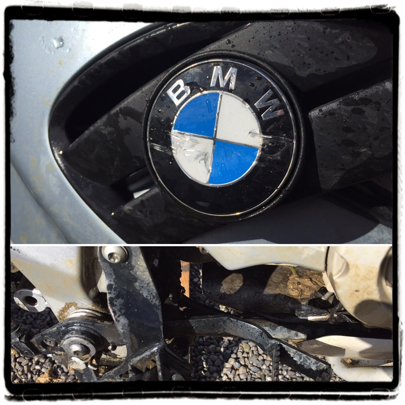 Het rempedaal werkte gelukkig nog (doordat het iets omhoog geplooid werd, was het zelfs makkelijker bij het offroaden). Met het gekrenkte BMW logo kon echter onmogelijk verder gereden worden. Maar goed, even vermannen en doorrijden.