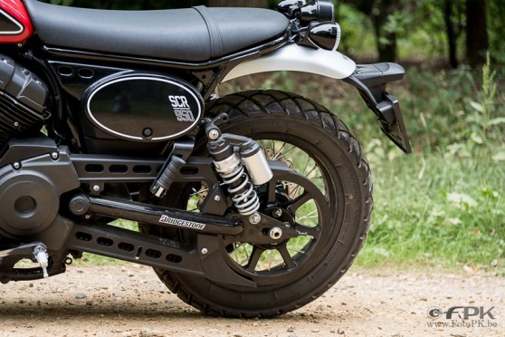 En dan komen we bij het scramblerhoofdstuk. Ik beken het direct: hier kon de SCR950 me niet overtuigen. Nochtans leent hij zich goed om recht op te staan. Zelfs zonder het stuur iets naar voor te kantelen, sta je mooi recht. Maar je merkt ook onmiddellijk dat je benen geen contact hebben met de motor. Oorzaak van die lichte spreidstand: de breed geplaatste voetsteunen. Ze zorgen ervoor dat je geen voeling met de motor hebt. Offroad bevordert dat het rijgevoel niet bepaald. En continu geforceerd je knieën tegen de tank duwen is evenmin ideaal.