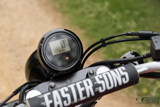 Die digitale display is trouwens zeer karig met info. Snelheid, kilometerstand, twee triptellers, klokje. That’s it. Geen toerenteller, geen versnellingsindicatie. De Japanse vingers bleven nog wel meer op de knip. Want je moet het ook stellen met slechts één remschijf vooraan (die net voldoende blijkt), rem- noch versnellingshendel zijn verstelbaar, moderne snufjes als mappings of tractiecontrole vallen niet te bespeuren. Mis je dat allemaal? Eigenlijk niet. Het basic karakter van de SCR950 zit ‘m als gegoten. Het betekent ook dat het prijskaartje basic kan blijven: 9.995 euro is bepaald niet overdreven.