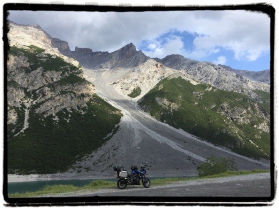 Direct duikt de Livignopas op. Vrij kort, vrij makkelijk, best mooi. Onderweg zoek ik op de gps naar een camping in de buurt. Camping Morteratsch blijkt het dichtstbij te liggen. Was aanvankelijk als een overnachtingsplaats gepland, tot ik de routes nog ’s omgooide.