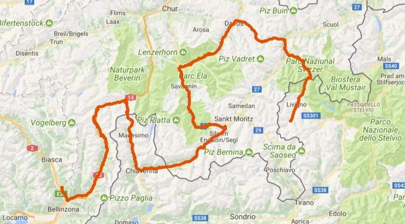 Afgevinkt: San Bernardinopas, Splügenpas, Malojapas, Julierpas, Flüelapas, Livignopas, Berninapas
