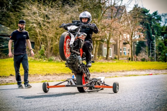 De Stunt and WheelieSchool werd pas vorige zomer opgericht en was van meet af aan een groot succes. Reden hiervoor is dat ze een volledig pakket aanbiedt dat nergens anders te vinden is: een gerespecteerde naam in de stuntwereld als lesgever, huurmotoren zodat je je eigen motor niet hoeft te misbruiken én het gebruik van een “Wheelie Safety Device” waardoor je niet op je gezicht of achterste valt mocht het misgaan.