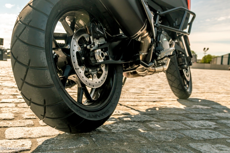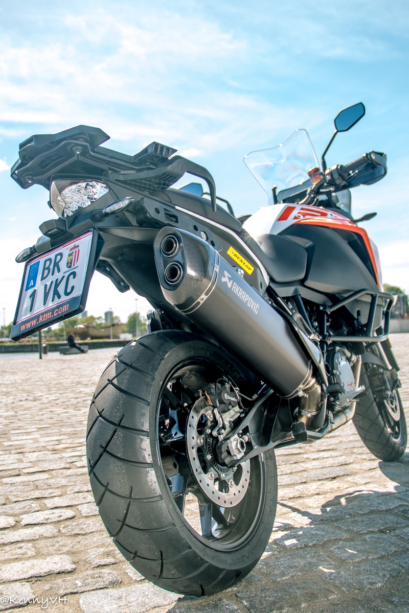 Zo’n 20.000 euro? Toevallig het prijskaartje van m’n test-KTM: 19.939,40 euro. Want die kreeg nog een reeks extra’s mee: mistlichten (494,95 euro), crashbars (286,65 euro), oranje cnc-gefreesde reservoirdekseltjes voor rem- en koppelingsvloeistof (48,64 euro + 28,80 euro + 19,79 euro), Akrapovic uitlaat (990,87 euro) met hittebescherming (157,72 euro), stickerkit voor de tankflanken (38,72 euro) en het Travel Pack (bestaande uit quickshifter, hill hold control en motor slip regulation, voor 693,27 euro).