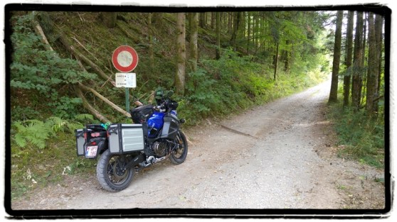 En dat was nog maar het begin. Een paar keer botste ik op wegen waar ik niet in mocht, stukken bos waar volgens de TomTom een pad door liep (nougatbollen ja), stukken onverhard (die ik wel nam maar waar ik me niet aan verwacht had – ik moet eens checken of je onverharde wegen kan vermijden met de TomTom) en stukken onverhard die me na een paar kilometer plots een halt toeriepen.