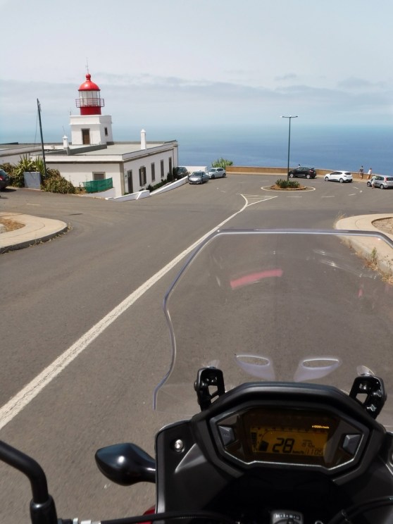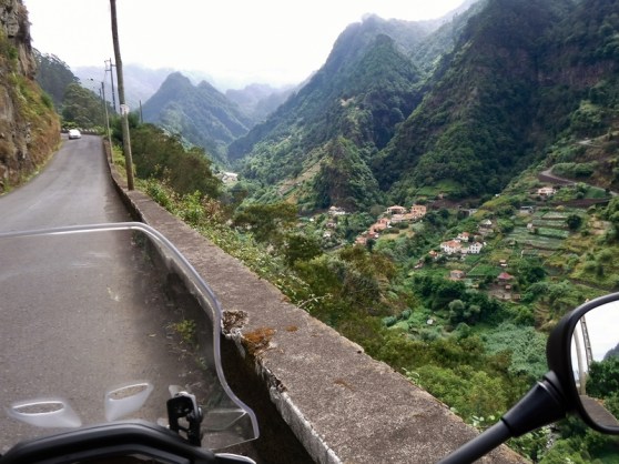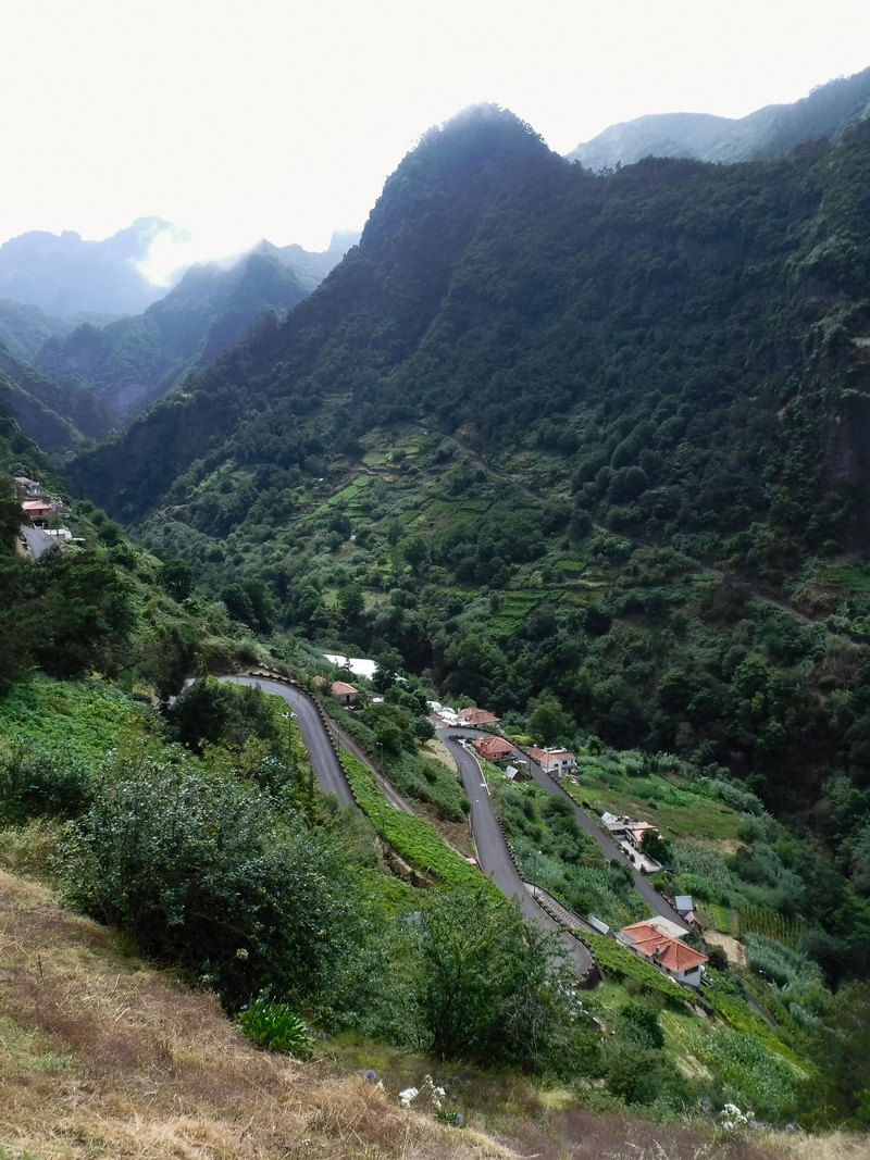 Ik kruis de ER110 en vervolg de ER209 richting het noordwesten. Dit blijkt achteraf een van mijn favoriete stukken te zijn: een perfect asfaltlint kronkelt vloeiend verder om hoe langer hoe meer bochten te bevatten. Eenmaal ik de afdaling naar Porto Moniz inzet, verslechtert het asfalt, nemen de haarspeldbochten toe en duik ik de mist in. De temperatuur zakt meteen een tiental graden en ik heb het zowaar fris.