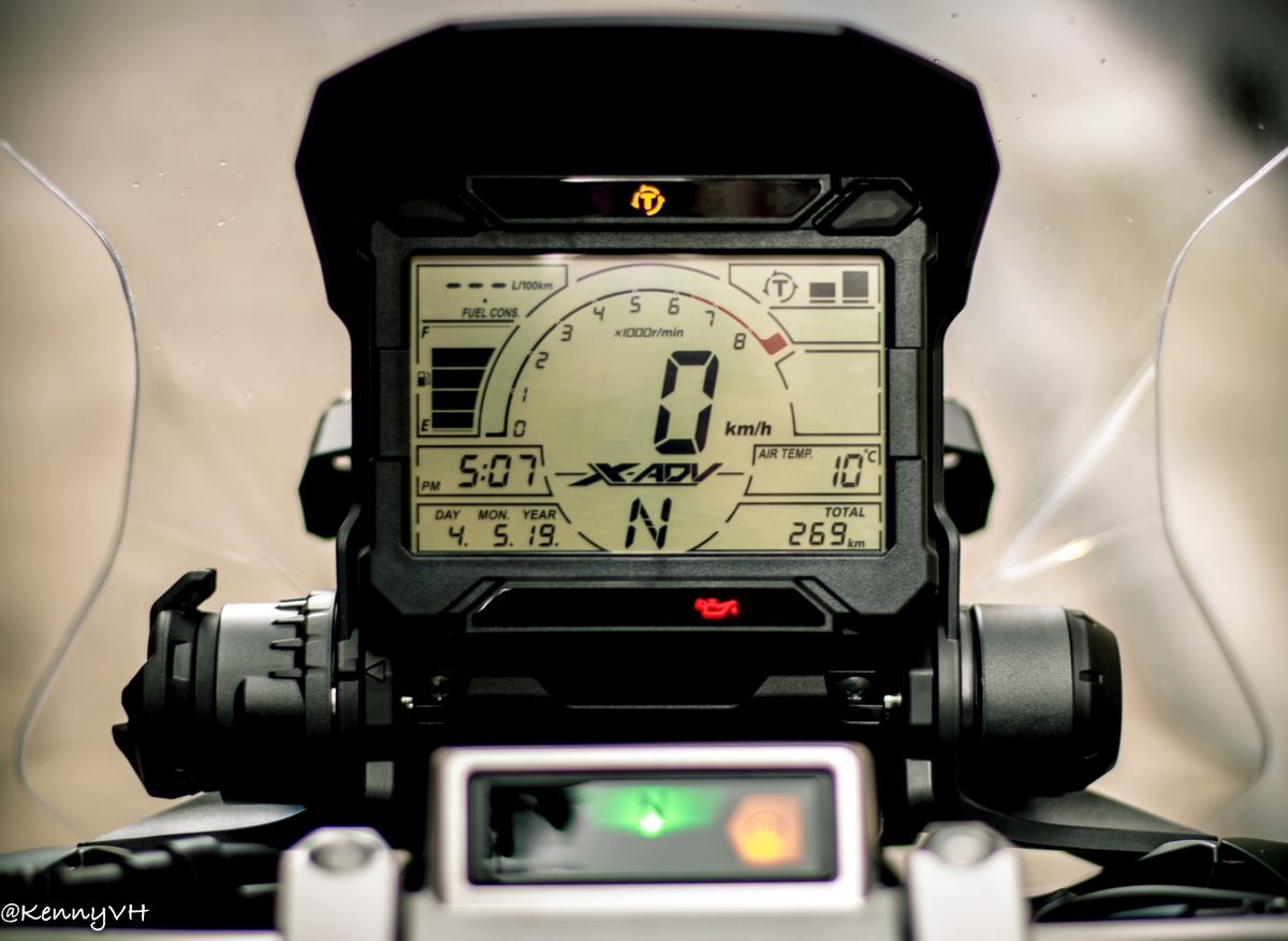 De handkappen – identiek aan die van de Africa Twin – leiden de wind goed weg van je handen en de handvatverwarming heeft eveneens vijf standen (de laatst gekozen stand wordt onthouden bij het uitzetten van de motor). Het dashboard is redelijk reflectie-gevoelig bij directe zoninval maar is goed afleesbaar, zowel overdag als ‘s nachts.