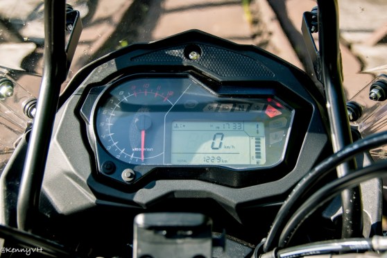 Het dashboard zelf is eenvoudig maar zeer duidelijk en compleet. Een mooie, analoge toerenteller, geflankeerd door een LCD-display met daarop de voornaamste info. Enkel de buitentemperatuur ontbreekt.
