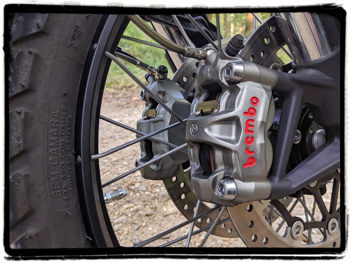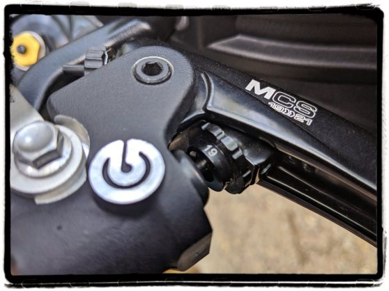 Het verstelbare MCS-remhendel komt offroad van pas. Hiermee kan je de bijzonder performante Brembo’s instellen om op onverhard minder direct in te grijpen dan op asfalt. Slim gezien. Stel je ze in om hard te happen op de baan, dan hoef je geen schrik te hebben van grote duikbewegingen. De XE duikt lichtjes in, maar niet dramatisch.