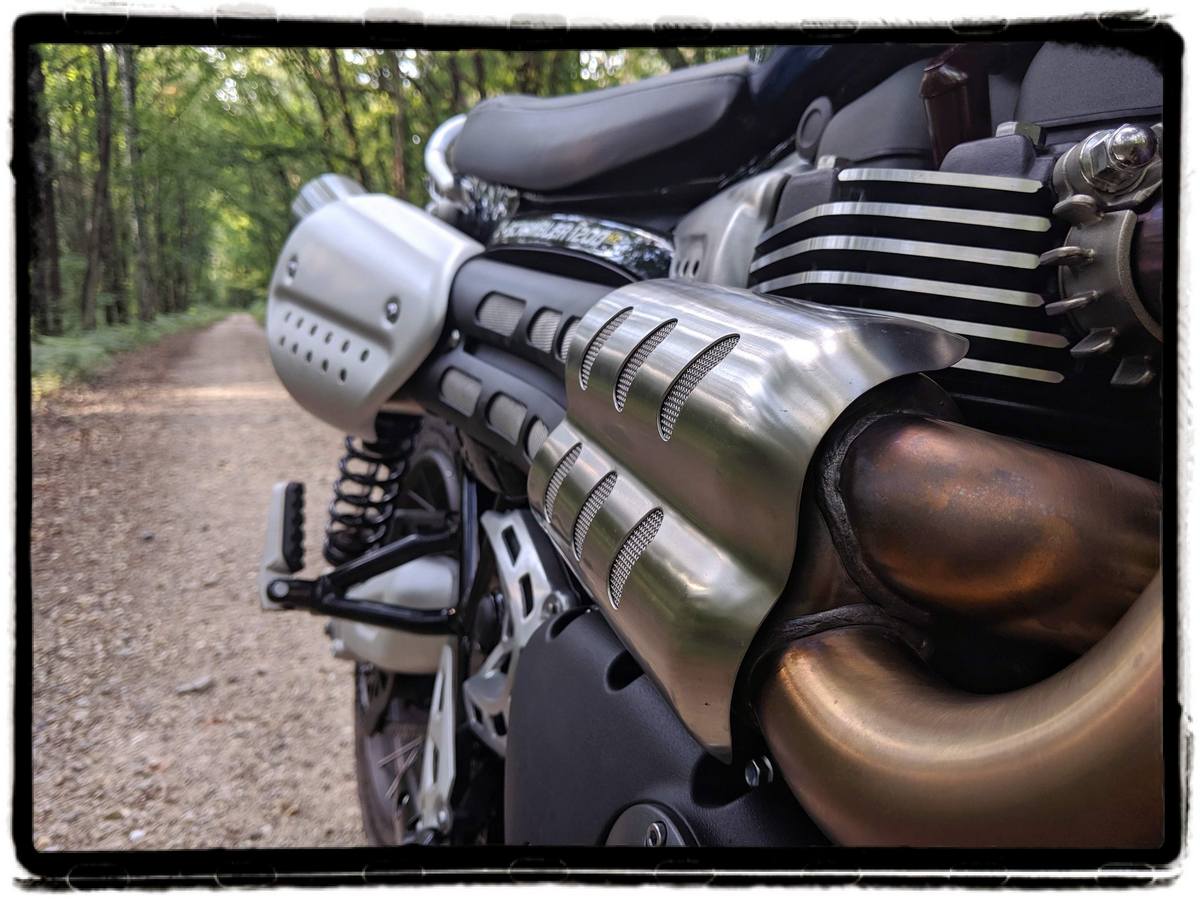 Over de uitlaat gesproken: z’n mooi gebogen, hoog geplaatste, dubbele pijp is nog zo’n typisch kenmerk van deze Scrambler. Wie schrik heeft dat z’n rechterbeen gegrild wordt: ik kan je geruststellen. Ja, de uitlaat gloeit als je ‘m bijvoorbeeld een uurtje hebt warm gestookt op de autostrade. Maar noem me ‘s een motorfiets die het daar niet warm van krijgt? Bovendien kan je dankzij het hitteschild gerust je onderbeen (in motorbroek uiteraard!) tegen de motor klemmen. Voor mij is de uitlaat dus absoluut geen tegenargument voor deze Scrambler.