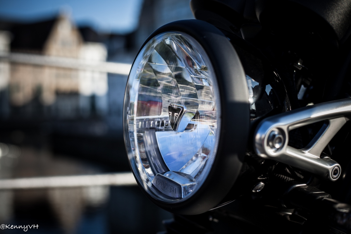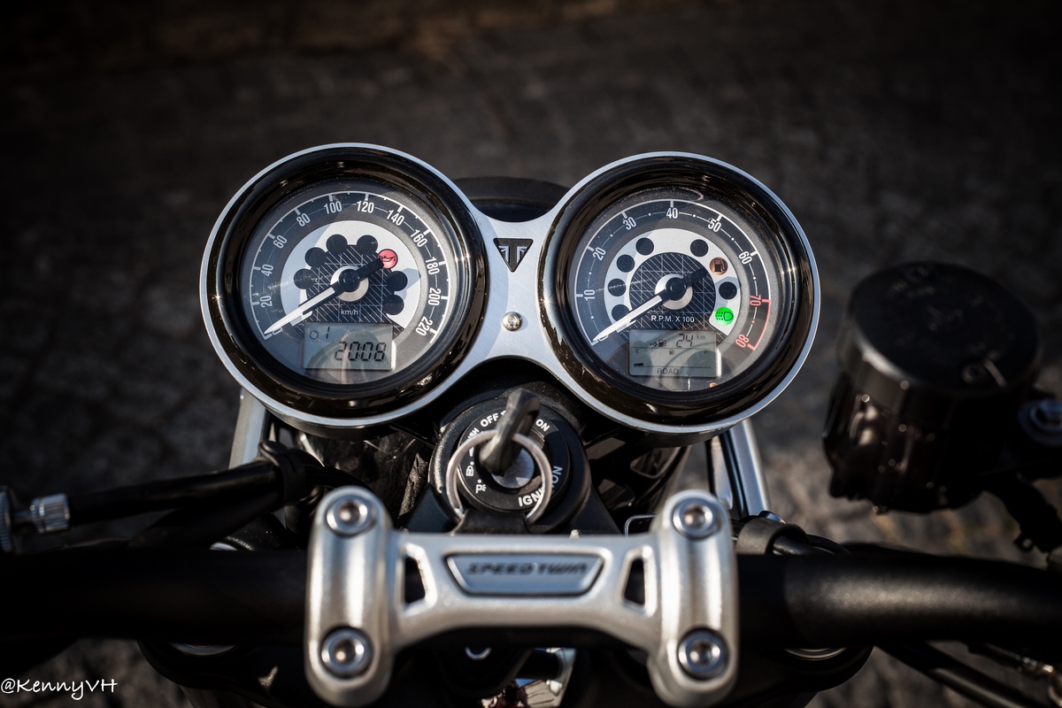 Het dashboard is een mix tussen analoge snelheidsmeter en dito toerenteller, en digitale schermpjes waarin je tripmeters, benzinemeter en gekozen modus kan aflezen. De meters lichten ontzettend mooi op in het donker. Ook het voorste LED-licht is een designstatement, met een halve cirkelvormige DRL waarin het Triumph logo verwerkt zit. De bar-end spiegels vind ik dan weer niet passen bij de rest van de motor. Ze trillen op de Speed Twin in ieder geval minder dan op de Street Triple RS.