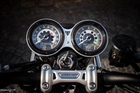 Wanneer ik op de Speed Twin ga zitten ben ik verbaasd. “Is dit echt een 1200 cc? Zo smal!”. De zitpositie is relaxed, de voetsteuntjes staan ver genoeg naar voren en het stuur ligt prettig in de hand. Het zadel is vlak en laat je makkelijk verzitten. De smalle tank kan je goed omsluiten met je benen, wat zorgt voor veel contact en gevoel met de motor.