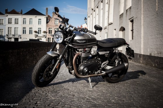 Eenmaal het tempo er in zit merk je hoe makkelijk deze Speed Twin rijdt. Alles gaat als vanzelf. Je kan er superontspannen hard mee gaan. De geometrie vraagt een beetje input bij het bochtenwerk maar de Speed volgt gedecideerd de gekozen lijn. Als het echt hard gaat lijkt de voorkant een beetje te zacht afgeveerd en zoals gezegd: vering instellen kan niet.