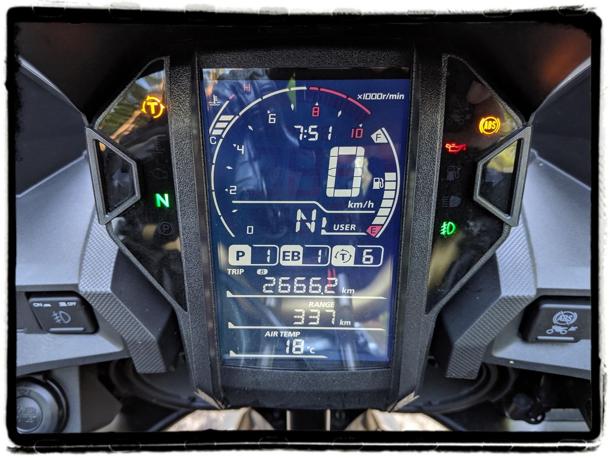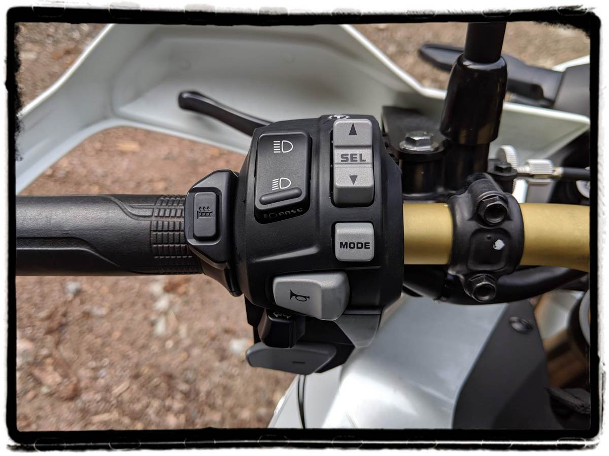 Naast de rijmodi zijn er nog een ABS die enkel achteraan maar wel in alle rijmodi uitschakelbaar is, en een G-knop voor offroadgebruik. Aan onverhard heb ik me niet gewaagd, ten eerste vanwege de bandenkeuze (Dunlop Trailmax), en ten tweede: legaal offroad in Duitsland? Hmmm.