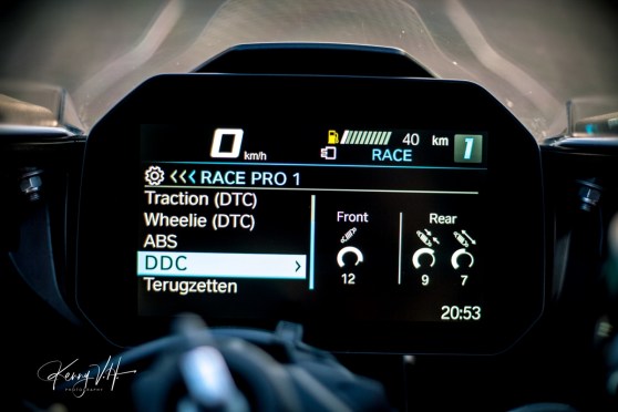 Met de optionele Rijmodi Pro komen er – speciaal voor de circuitrijders – nog een Race Pro 1, Race Pro 2 en Race Pro 3 bij. Bij deze rijmodi kan je alle mogelijke instellingen volledig zelf regelen. Dat gebeurt via BMW’s bekende multicontroller (aka het draaiwiel) waarmee je door het intuïtieve menu van het 6,5 inch TFT-scherm scrolt. Dit scherm vind ik nog steeds het beste van wat er in motorland is. Mooi vormgegeven, simpel in gebruik, groot, duidelijk af te lezen. Je kan kiezen tussen het Pure Ride scherm dat alle gegevens heerlijk eenvoudig weergeeft, of voor een van de drie Core Screens die snufjes als hellingshoek, remdruk en gasopening weergeven.