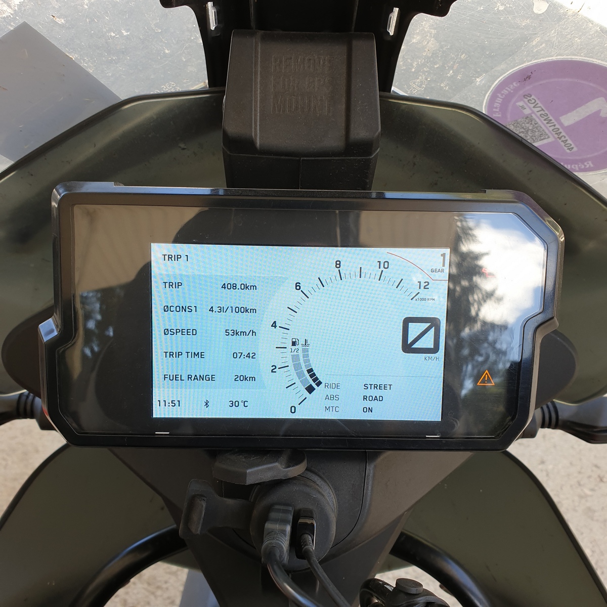 Na enkele kilometers peentjes zweten stijgt de actieradius weer, maar hij komt niet boven de 30 km, laat staan dat hij de 90 van gisteren haalt. Blijkbaar moet de sensor ergens in het rechtse tankdeel zitten waardoor de 790 een fout benzineniveau aangeeft nadat hij op de zijpikkel heeft gestaan. Gedurende heel de reis blinken de benzinemeter en actieradius uit in onbetrouwbaarheid en wispelturigheid.