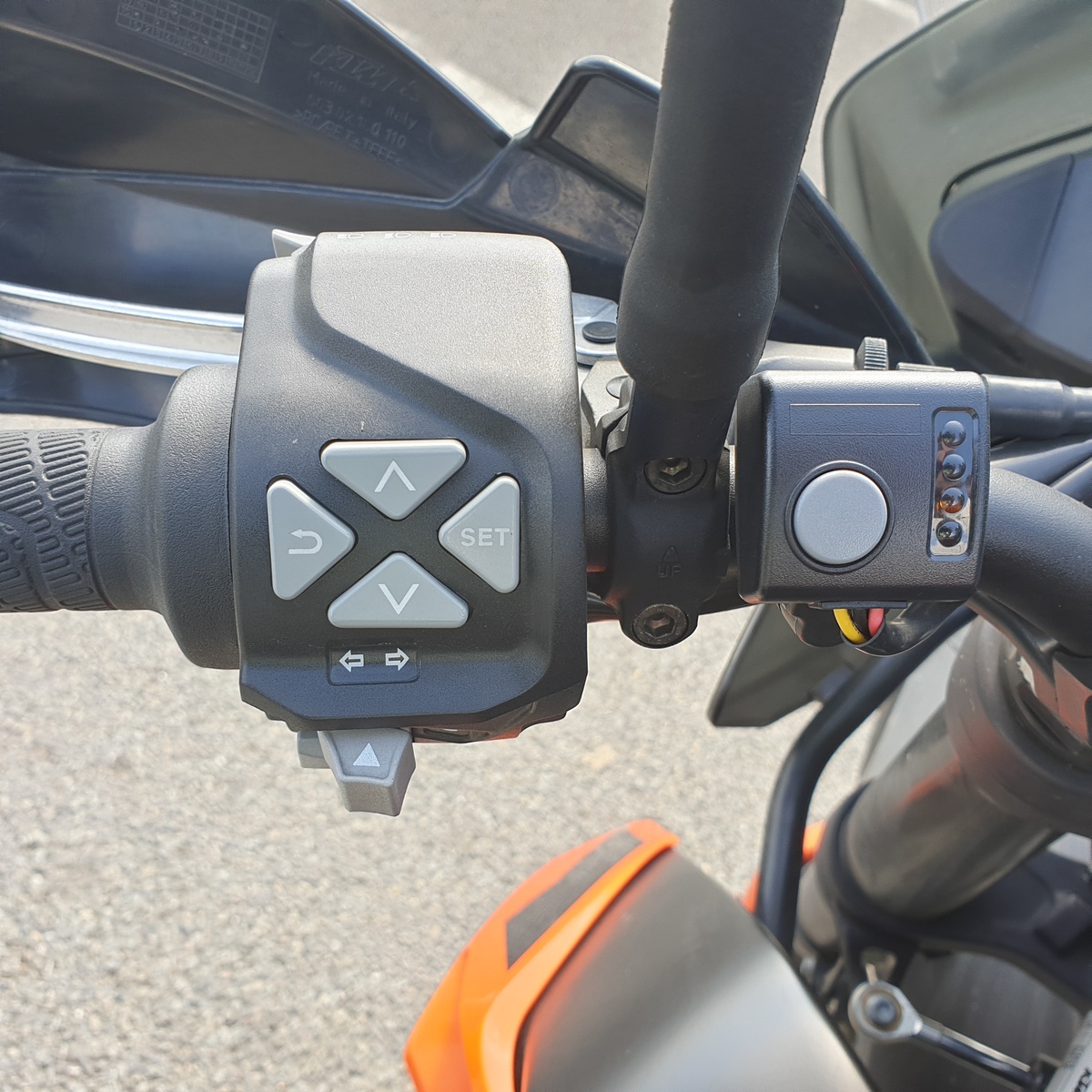 De instellingen van alle elektronische hulpmiddelen zijn af te lezen op het mooie TFT-scherm. Bedienen doe je via knoppen op de linker stuurhelft. De menustructuren zijn intuïtief opgebouwd waardoor ik al snel zonder naar het display te kijken bepaalde dingen kan instellen.