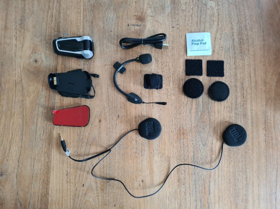 We kozen voor de Cardo Packtalk Bold Duo, wat betekent dat je een dubbele set koopt met een mooie korting. In de doos vind je naast de twee units alle accessoires om het systeem op je helm te monteren.