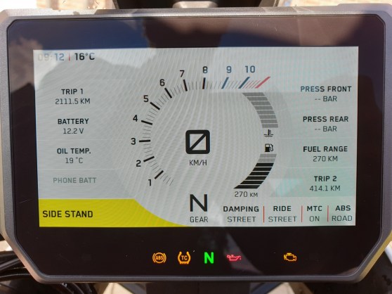 De 23 liter grote tank en het in 9 standen verstelbaar scherm onderstrepen het toerkarakter van deze dikke fiets. Ritten van 350 km bleken makkelijk haalbaar. De koffers zijn onhandig van vorm en aan de kleine kant maar de ophangpunten zijn naadloos geïntegreerd in het subframe. Standaard handvatverwarming, bandendrukcontrole en cruisecontrol maken het leven tijdens lange ritten zorgeloos. Kleine opbergvakjes in de kuip, een USB-poort en een 12V-aansluiting vervolledigen het toerplaatje.