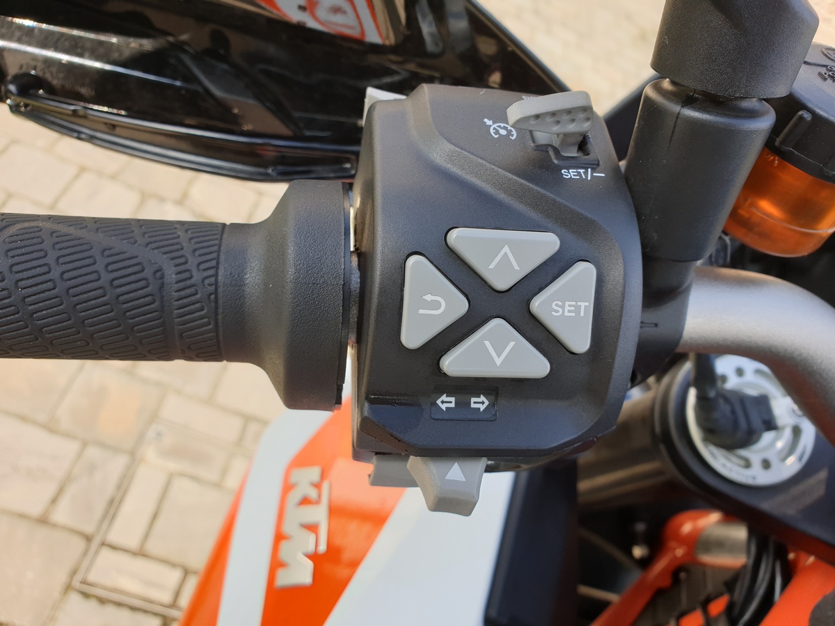 Maar zeg nu zelf: rustig cruisen, daar is de GT niet voor gemaakt. Draai je het gas open dan ontbindt dit beest al zijn duivels. De manier waarop dat gebeurt kan je zelf kiezen via het 6.5” grote TFT-scherm, gekend van op de 1290 Super Adventure. De 4 rijmodi passen de powerafgifte aan en kan je instellen op Rain (100 pk), Street, Sport en Track. Voor dagelijks gebruik is Street meer dan voldoende: ook dan trekt hij in derde versnelling het voorwiel los van de grond. In Rain-modus voelt de GT mak aan, in Sport en Track wil hij je armen eraf trekken. Gelukkig staan de remmen op eenzelfde sportief niveau. Bij aangrijpen geven ze veel gevoel, bij iets harder knijpen is de vertraging fenomenaal.