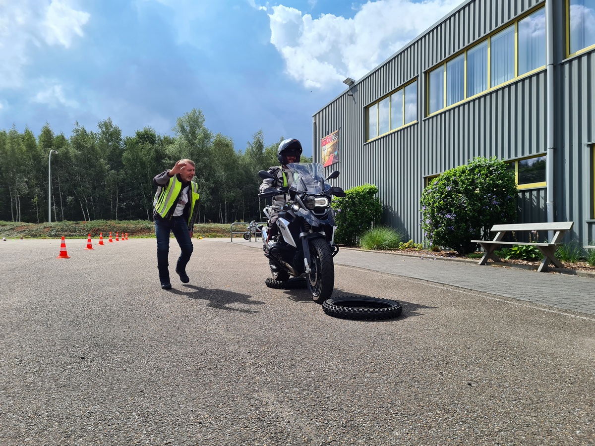 Aansluitend hierop volgde nog een luik over veiligheid op de weg en toen was het tijd om die brok theorie om te zetten in de praktijk. Hiervoor stond op een groot terrein een massa kegeltjes verspreid. En de zonnige dag werd al snel een zweetdag.