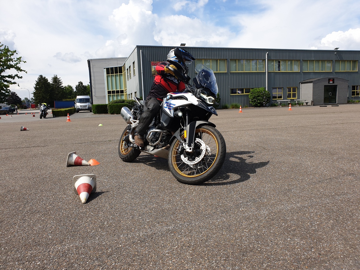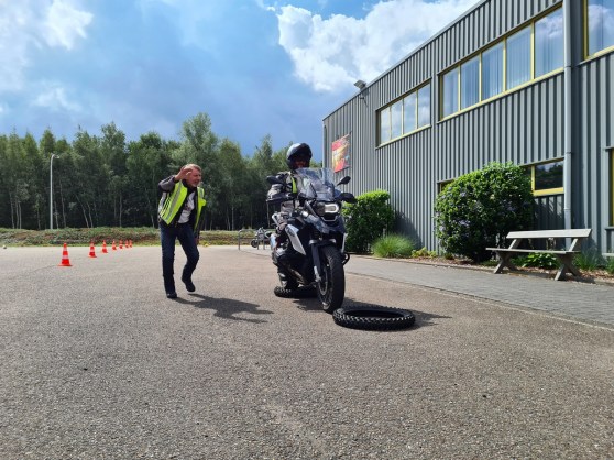 Eerste oefening waar ik het warm van kreeg: slalommen tussen kegels. Ja, dat heb je ook moeten doen om je motorrijbewijs te halen. Hier werd gekeken naar de verschillende technieken die je kan toepassen: je motor rechthouden en puur op stuuruitslag rond de kegeltjes draaien, of de motor kantelen en met je lijf het tegengewicht vormen. En dat allemaal zeer traag. Klinkt misschien easy, maar voor ons alledrie was het toch weer even wennen. Want dit soort dingen oefen je niet elke dag. Het spel met koppeling, gas en rem dat je normaal blindelings doet, ga je hier heel juist en verfijnd moeten toepassen. Ik merkte voor mezelf dat ik te zenuwachtig met de koppeling speel, in plaats van ze rustig te bedienen en mijn snelheid te bepalen met de achterrem. Ook achtjes draaien, een slakkenrace (wedstrijdje zo traag mogelijk rijden), een grotere slalom en over een balk rijden stonden in de voormiddag op het programma.