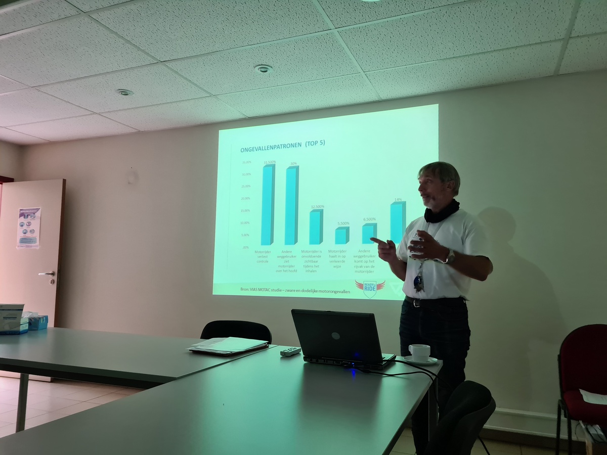 Marc wist doorheen de hele dag fijne praktische tips mee te geven, waarvan ik mijn favoriet graag meegeef, want ik maak er me zelf schuldig aan. Als je vaak eerst afremt op de motor, en pas heel laat je rem gebruikt, denk dan ‘s aan de weggebruikers achter je. Een automobilist ziet vaak moeilijk dat jij al aan het vertragen bent. Dus rem gerust af op de motor, maar raak ook heel lichtjes je achterrem aan. Zo ziet je achterligger wat je aan het doen bent.