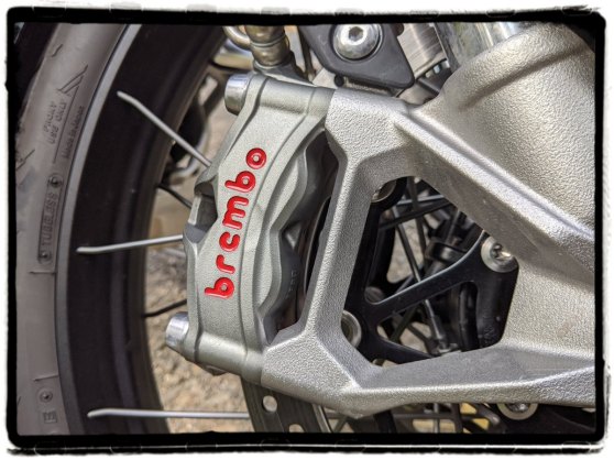 Op veel motorrem moet je evenmin rekenen, maar gelukkig werkt de achterrem zeer goed en is hij perfect doseerbaar. Ook de klauwen vooraan weten van wanten. Kan ook niet anders, want met de Brembo Stylema’s hangt er goed gerief aan je fiets.