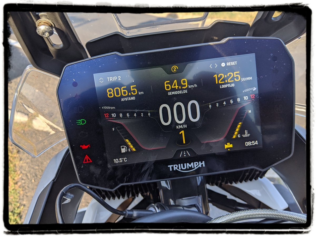 Z’n snelheidsmeter tot slot. Twee maanden geleden maakte ik me bij de Ténéré 700 nog druk over het grote verschil tussen de snelheid op de display en die op m’n gps. De Tiger is in hetzelfde bedje ziek. Tuffend over de Hollandse autostrade: 110 km/u volgens de Tiger, 100 km/u volgens m’n TomTom. Tja.