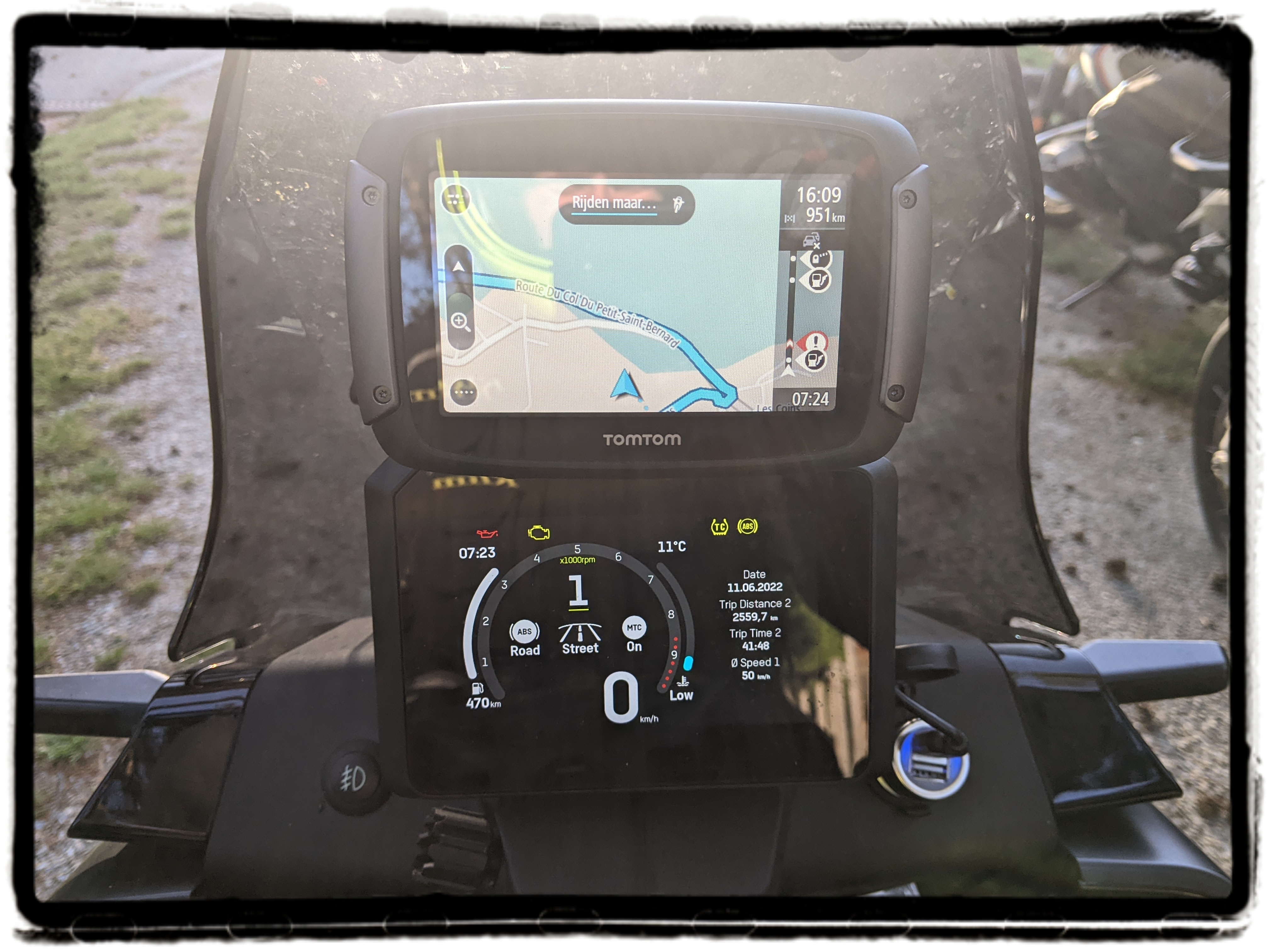 Al die zaken regel je via de knopjes links op het stuur. De menustructuur is eenvoudig zodat je heel snel doorhebt waar en hoe je alles kan instellen. De display weet daarbij de info overzichtelijk te vatten. Lijkt allemaal doodsimpel en vanzelfsprekend, maar als ik me even onze vorige testmotor voor de geest haal (de Yamaha Tracer 9) … Je kan het ook danig verprutsen.