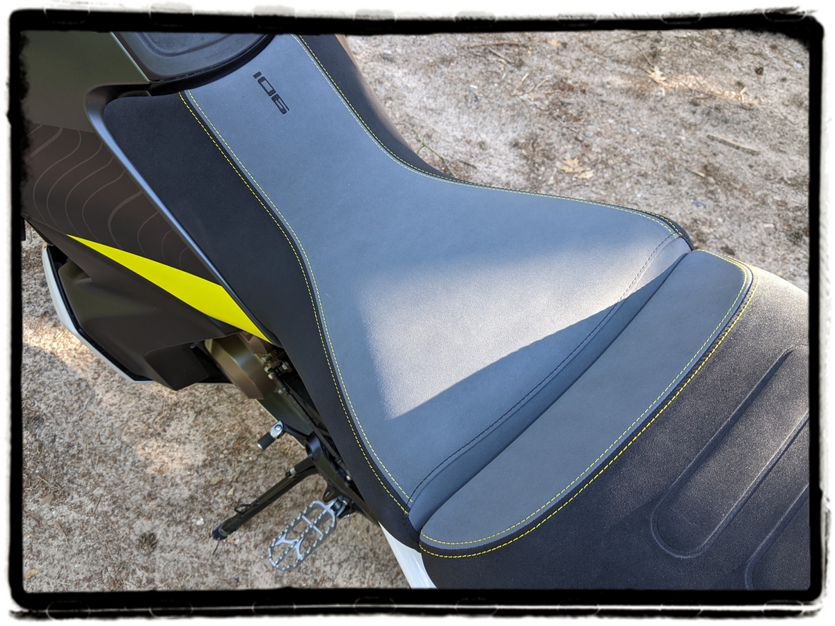 Het is echter vooral het zadel dat opvalt: mijn test-Husky heeft het optionele comfortzadel. Met 874 mm in de hoogste positie zit de Norden exact even hoog als mijn Ténéré 700, maar terwijl ik op de Yamaha vlot met de voetjes plat aan de grond kan, zorgt het uitzonderlijk brede zadel van de Husky ervoor dat ik moeite moet doen om met de punten van beide laarzen tegelijk de grond te raken. Moet ik er wel eerlijkheidshalve bij vertellen: de voorspanning van de achterschokdemper had ik volledig opengedraaid. Onderweg met volledige bepakking, weet je wel. Ter info: in de laagste stand zit je op 854 mm, en het standaardzadel is even breed en hoog.