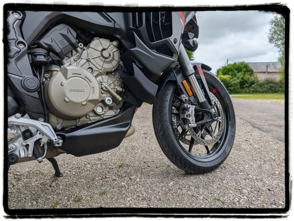 Ducati koos ervoor om de rubberen stuurdemping te verwijderen. Voor meer feedback en scherpe stuurgedrag klinkt het. De Grand Tour is de enige V4 waarbij dit trucje wordt toegepast. Je zou je tegelijk kunnen afvragen waarom het 17” voorwiel van de vorige generatie dan vervangen werd door een 19” exemplaar. Gaat de stabiliteit zo hard achteruit met een 17-duims? Trouwens, de RS en Pikes Peak kregen wel nog een nummertje 17 gemonteerd.