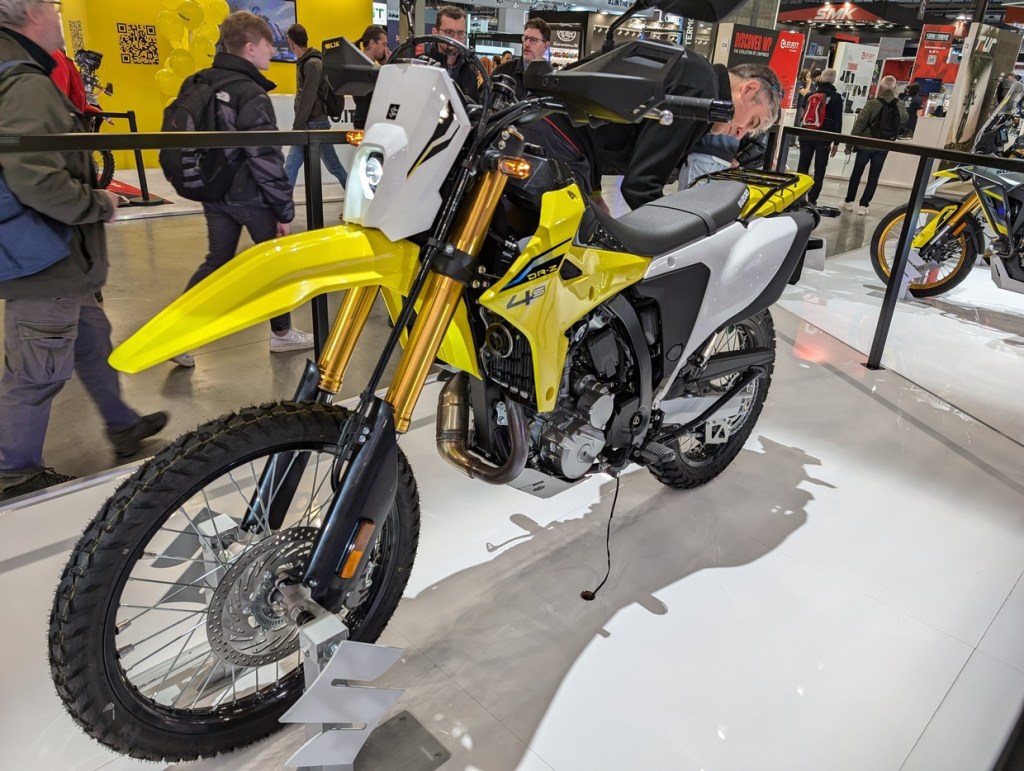 Geheel persoonlijk en in willekeurige volgorde. Al begin ik met mijn absolute nummer één: Suzuki’s splinternieuwe DRZ-4S en SM. Niet in het minst omdat ik zelf een DRZ in mijn garage heb staan. Sinds 2008 worden ze niet meer in Europa verkocht, maar in andere delen van de wereld gaan de DRZ400E, S en SM nog steeds als zoete broodjes over de toonbank. Al 23 jaar is de DRZ – op wat andere kleuren na – niet meer veranderd. Nu komt er dus een nieuwe met dezelfde longinhoud, injectie (Euro-5+), ride by wire en zelfs met rijmodi. Zowat alles is nieuw, al zijn ze er wonderwel in geslaagd de typische DRZ look te bewaren. Ik ben nu al fan. Jammer genoeg kon ik er niet op zitten: de DRZ stond netjes afgeschermd.