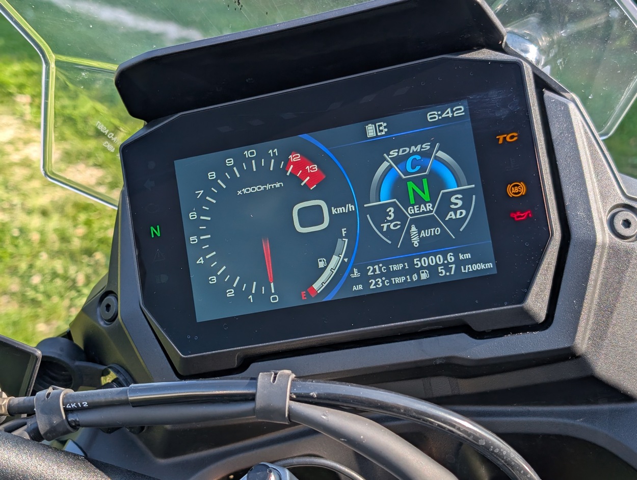 Gaat het tempo de hoogte in, dan zet ik de demping op hard. Dat gaat makkelijk maar niet erg intuïtief. Zelfs na een week rijden moet ik nog steeds naar het scherm kijken om zeker te zijn van mijn aanpassingen. De middelste standen van de vering zijn een beetje vis noch vlees en zal ik nooit gebruiken. Hetzelfde geldt voor de rijmodi: de onduidelijke benamingen A, B en C worden door Suzuki handig ingevuld als Active, Basic en Comfort waarbij Active de meest directe gasresponse en dito controle biedt. Bij standje C zit er een duidelijke vertraging in de gasaanname en wordt het vermogen beperkt.
