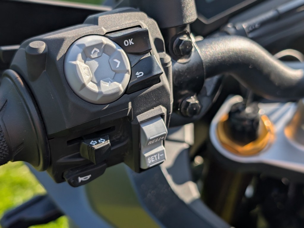 Het is op dit fantastische stukje weg bomvol hobbels dat de GX me definitief verleidt. De Skyhook vering draait overuren maar raakt nooit van de wijs terwijl de dikke viercilinder zich zonder problemen doorheen de krapste bochten laat leiden. Tel daarbij de fantastische quickshifter die je zowel op als af met open gas kan bedienen en ik ben verkocht.