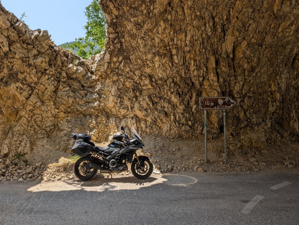 Al snel laat ik de hectiek van de Montenegrijnse hoofdstad achter me en wat volgt is een halve dag vlotte, snelle, bochtige wegen langs diepe kloven en doorheen donkere tunnels. Het is in tunnel 9 – ze zijn genummerd – dat ik ontdek dat het grootlicht van de GX helemaal niet groot is. Verrast door een bocht middenin de onverlichte tunnel kan ik de zijkant op een haar na ontwijken en dat mét het grootlicht aan.