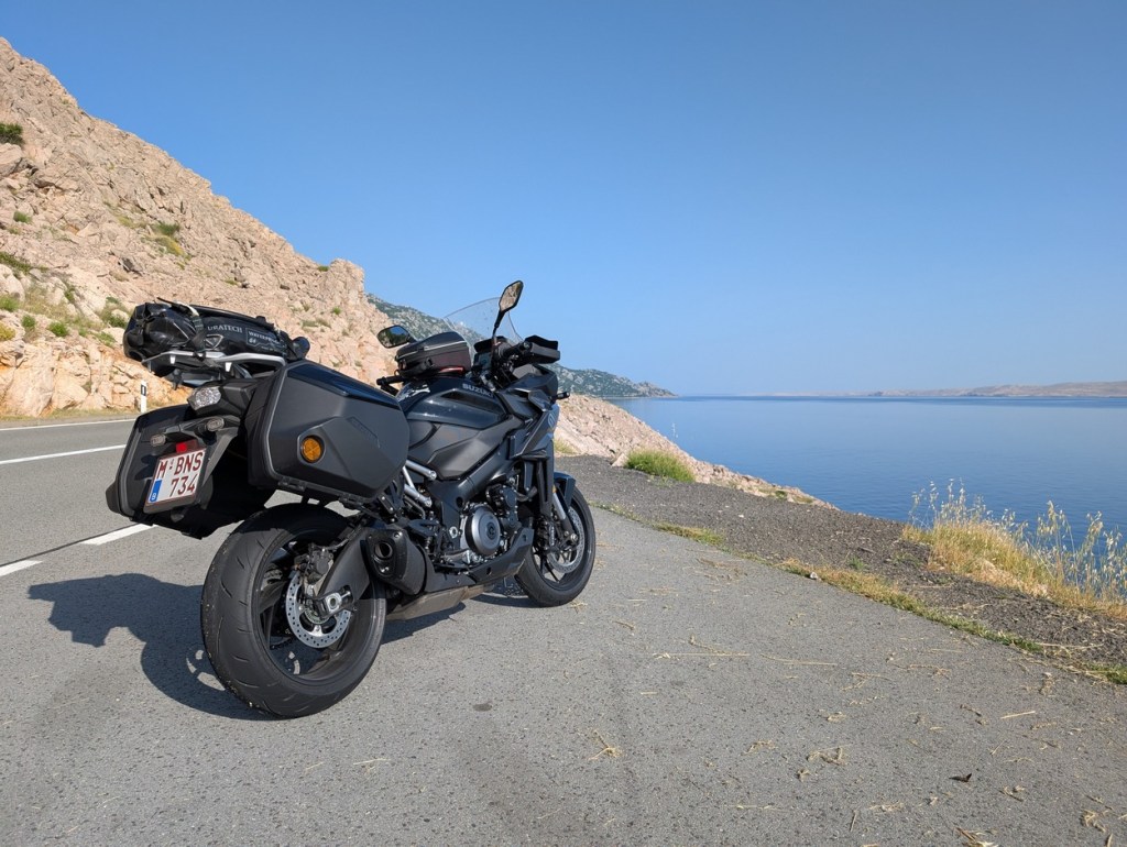 Ook naar de beste veringinstelling is het even zoeken. Er zijn vier dempingsstanden: zacht, medium, hard en user mode, die je allemaal in het menu kan finetunen. Voor de veervoorspanning is er de keuze uit uit solo, mét bagage, mét duo of automatisch. Bij die laatste stand past de GX de rijhoogte automatisch aan de belading aan. Ik kies uiteindelijk voor automatische voorspanning en – verrassend genoeg – voor de softe demping. Die is ideaal als je vlot rijdend van de mooiste kustlijn van Europa wilt genieten. De D8 wordt ook wel de Jadranska Magistrala genoemd, en magistraal is die zeker!