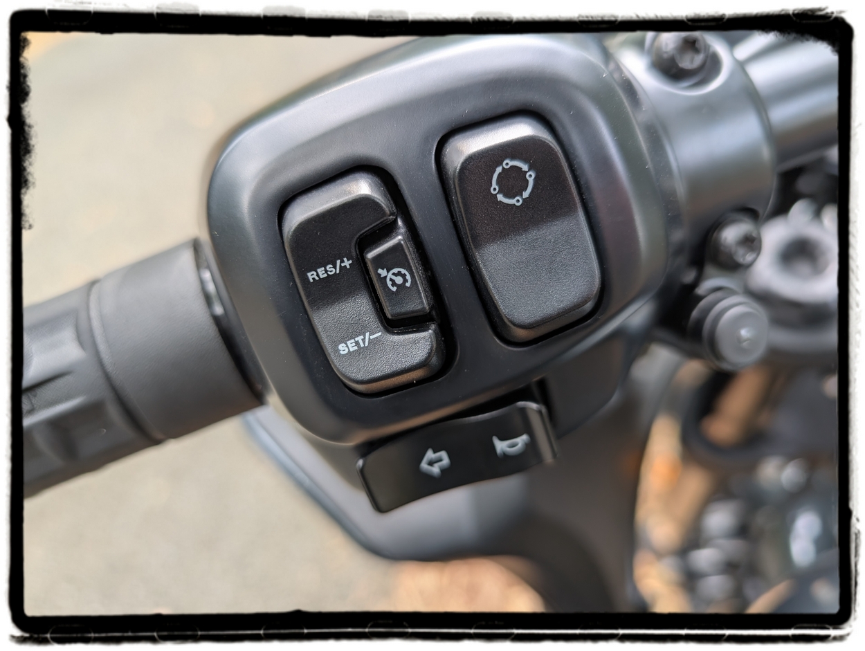 Cruisecontrol is standaard op de ST, handig tijdens lange asfaltlappen rechtdoor. Werkt prima en laat zich intuïtief bedienen. Een duidelijk verbetering sinds ik de laatste keer een Harley cruisecontrol onder de vingers had, op de Pan America. Al is er nog ruimte voor progressie: zet even de snelheid op de digitale display. Want hoe mooi de ronde analoge snelheidsmeter ook is, heel precies kan je de snelheid niet aflezen. Streepjes staan er per 10 km/u op en door het kleine formaat is je exacte snelheid eerder gissen dan weten.