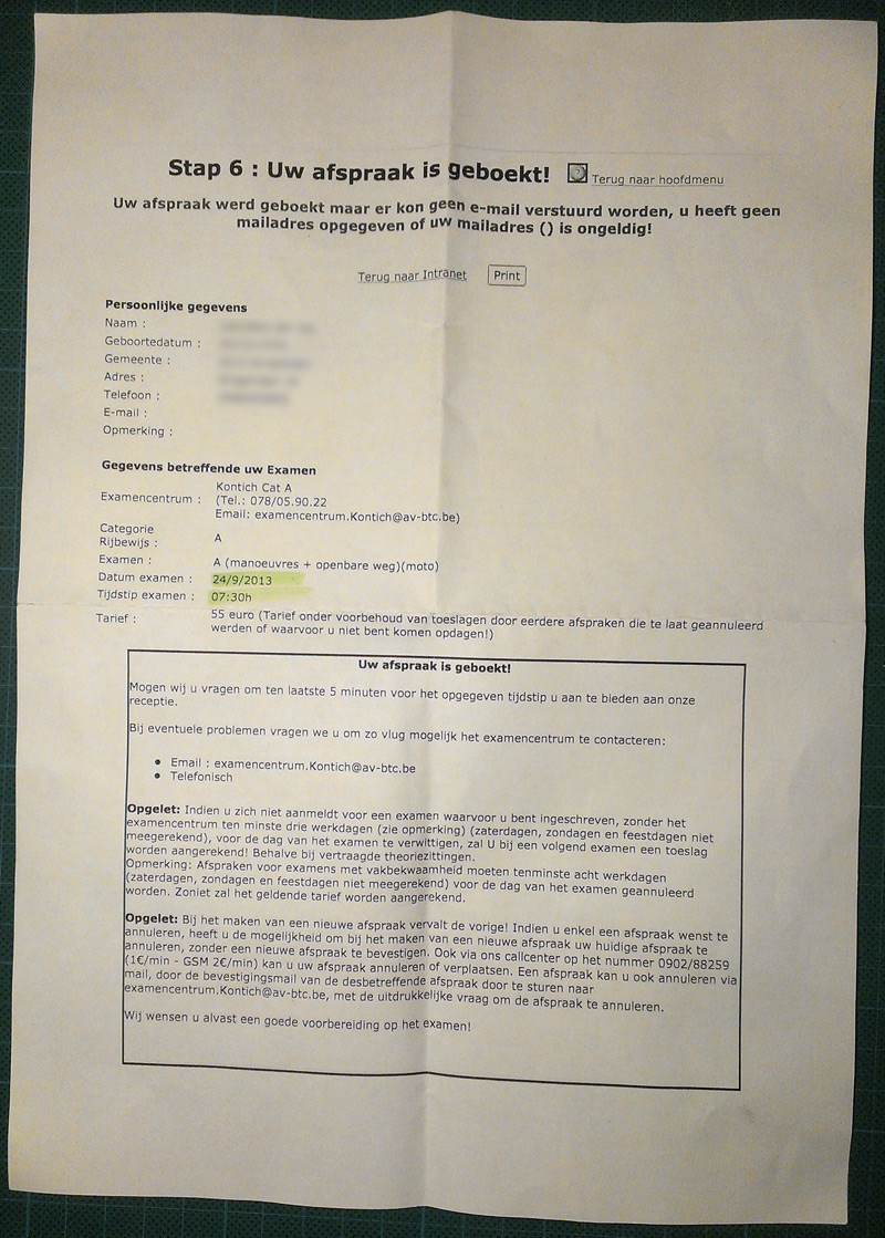 Zoals vorige keer beloofd moest ik maar 25 euro betalen, maar ik mocht nog 19 euro extra ophoesten want het examencentrum moest een volgmotor voor de examinator voorzien. Euh … oké dan …