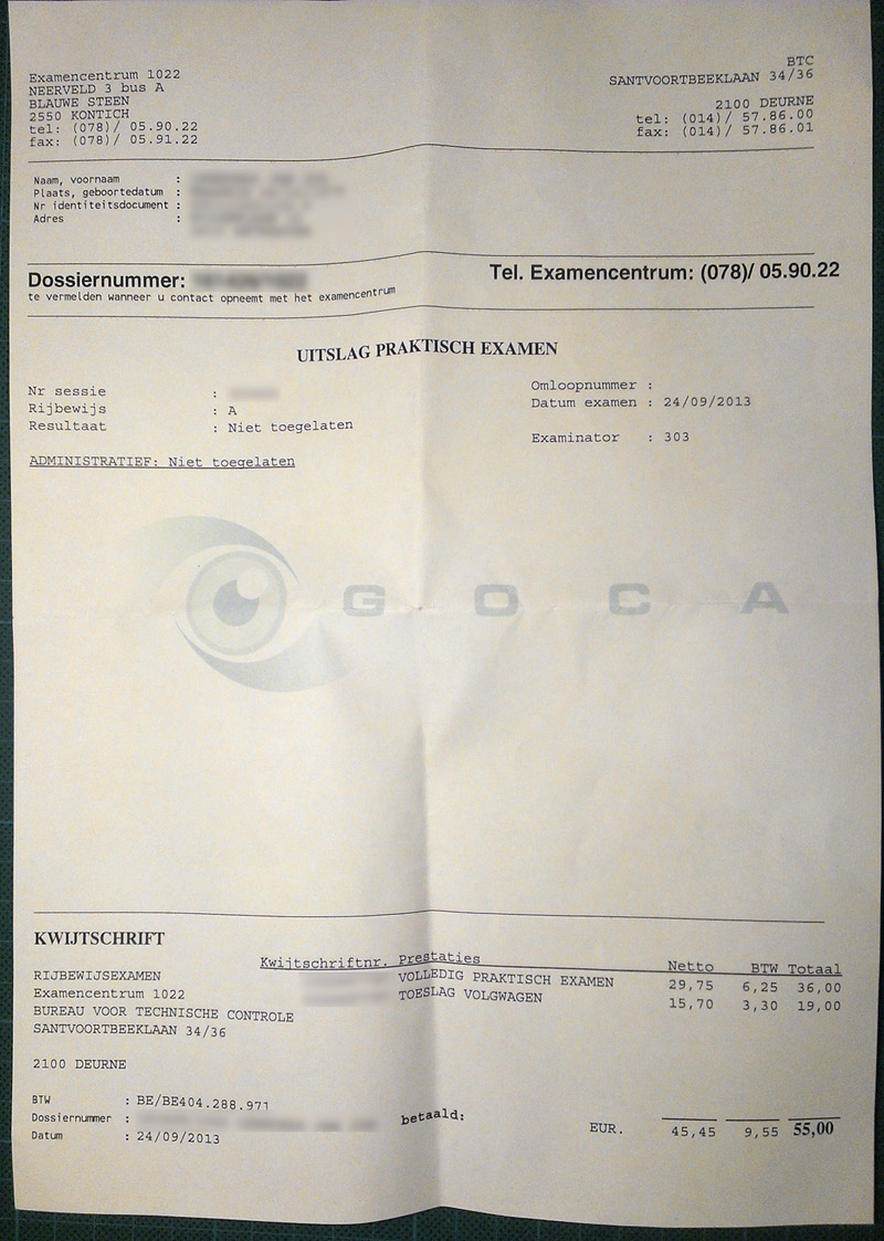 Praktisch rijexamen, 1ste poging, administatief afgekeurd: 55 euro
