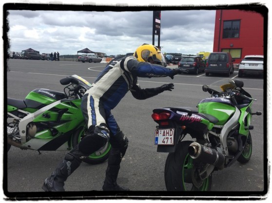 Over het theoretische deel schreef ik hier al eerder. Er werden geen nieuwigheden verteld, maar toch verliepen de eerste rijsessies nogal gespannen. Vooral de eerste: het circuit lag er nog nat bij na een regennacht. Gelukkig kwam de zon door en droogde het asfalt tegen de tweede rijsessie helemaal op. Maar toch: ik had tijd nodig om er terug in te komen. Opmerkingen van de instructeur: bovenlichaam ontspannen, meer met het lichaam naast de motor hangen, constantere gasopbouw bij het uitkomen van de bochten.