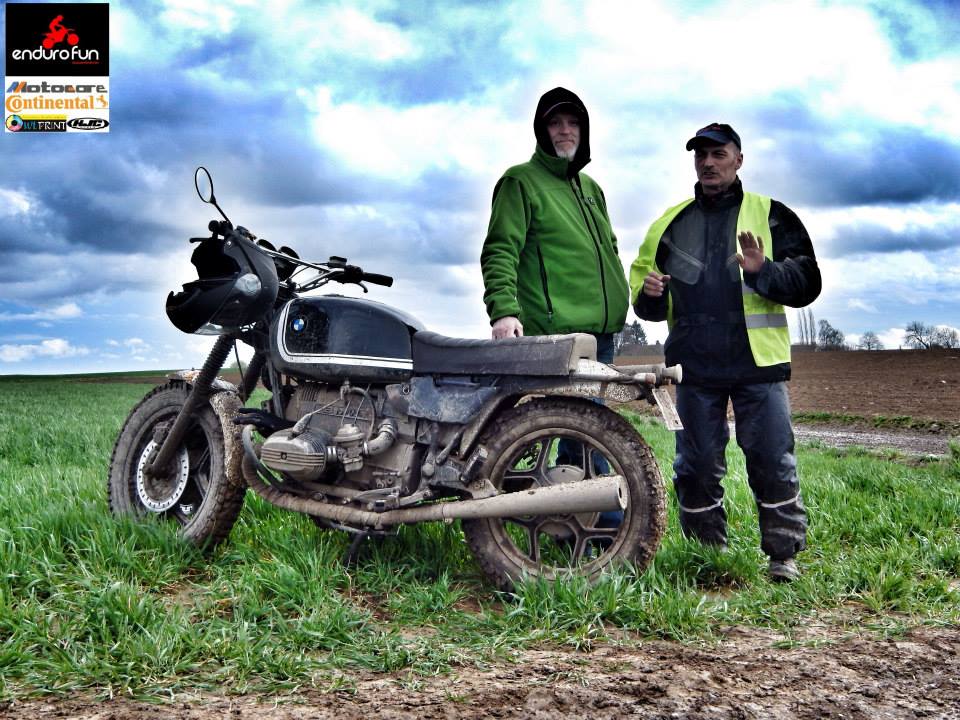 In de voormiddag moet ik de motor nog twee keer laten vallen. Eén keer als ik in een smal moddergeultje zit te rijden tegen de rand van een holle weg, en ik de motor domweg niet meer kan houden als hij uit het geultje glipt. De motor valt in een doornstruik, dus een paar kleine krasjes op de rechterflank. De andere keer op een bemodderd kasseipad, ik kan mijn evenwicht niet houden, en mijn schoen blijft net te lang achter de voetsteun haken (dat heb je dus niet voor mét rubbers), en daar gaat hij weer aardwaarts. Deze keer wel wat schade (merkte ik achteraf thuis), een gaatje en wat krassen op mijn plastic kuip.