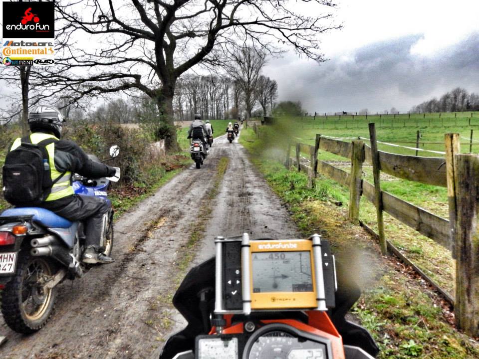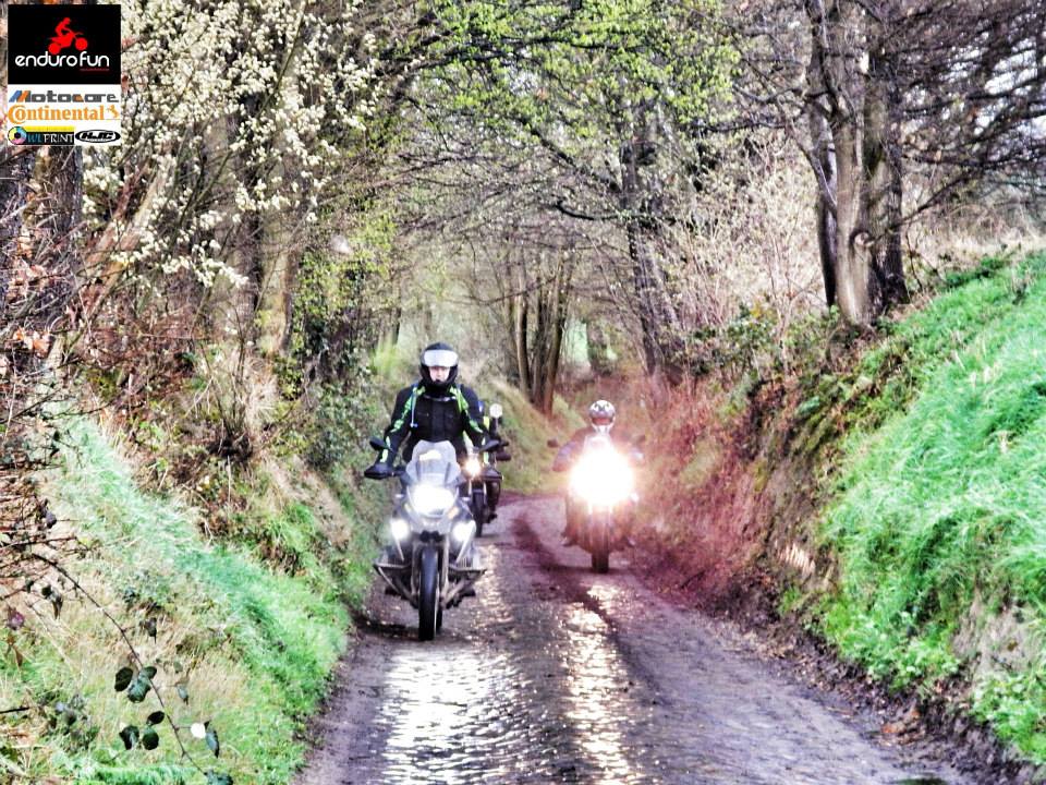 Start de motoren, we vertrekken! Het regent, en al heel snel blijken de offroadstukken er erg slipperig en modderig bij te liggen. De snelheid ligt erg laag en soms moet een voetje aan de grond gezet worden om een val te voorkomen. Maar het is niet te vermijden: af en toe gaat er eentje tegen de grond in onze groep. De schade blijft gelukkig minimaal.