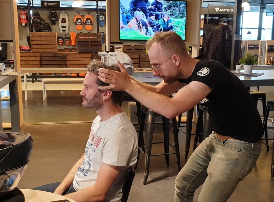 Een systeemhelm. Bleek een goeie keuze, want het is leuk om met de klep omhoog te rijden. Als het tempo niet te hoog ligt tenminste. Of je moet graag vliegen eten.