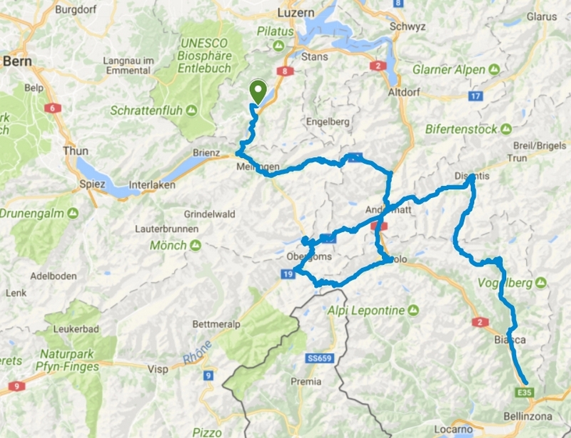 Afgevinkt: Sustenpas, Furkapas, Grimselpas, Nufenenpas, Tremolapas, Gotthardpas, Oberalppas en Lukmanierpas