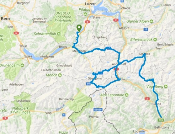 Wie me volgt op Facebook weet het al: ik ga op motortrip. Lastminute beslissing, nu woensdag vertrekken. Geen allroadreis deze keer, maar onroad. Want dag 8 van de Alpentrip van vorig jaar (met de Grote Sint-Bernhard- en Grimselpas) smaakte naar meer. Heel wat uurtjes in MyRoute-app zitten puzzelen, het resultaat ziet er zo uit:
