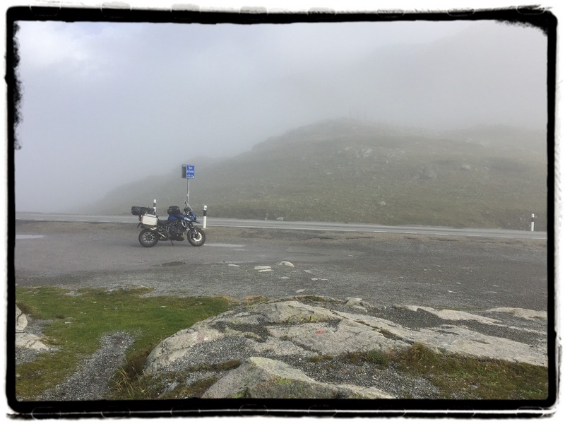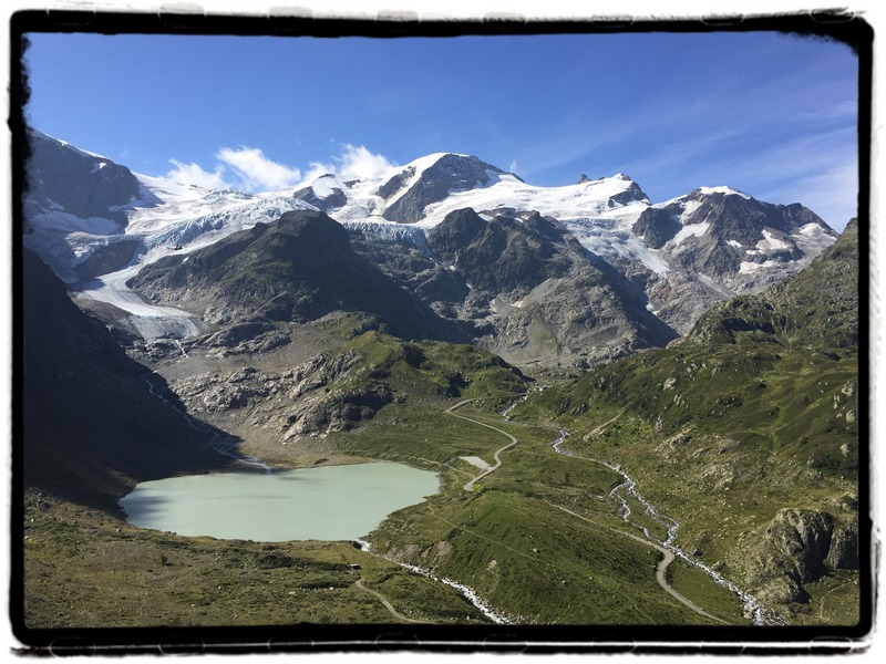 Maar goed, we gaan geen tent shoppen vandaag, we gaan rijden. Eerst het stukje Berninapas dat niet in m’n oorspronkelijke route zat. De bergen spelen verstoppertje achter het wolkendek en laten zich maar af en toe zien. Ik maal er niet om, het zicht op de baan is goed, er is nul verkeer, fijn rijden zo.