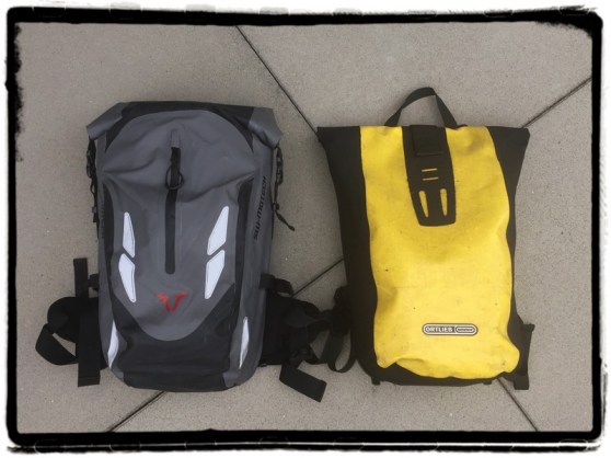 Ik heb meer dan een jaar een Ortlieb Velocity rugzak gebruikt, tot SW-Motech vroeg of ik hun Baracuda motorrugzak wou testen. Beide zijn waterdicht en hebben een rolsluiting. In de Baracuda kan 25 liter, in de Velocity 24 liter. En ze gaan voor ongeveer 100 euro over de toonbank. Erg gelijkaardige rugzakken dus. Dat vraagt om een vergelijkende test.