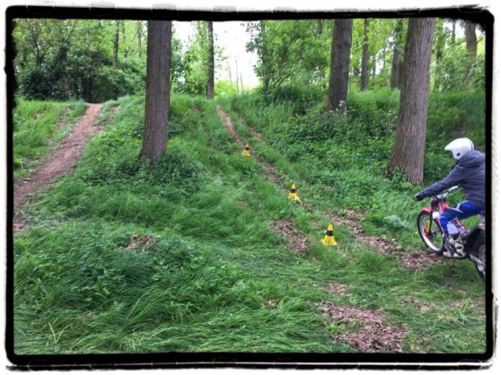 Bij het woord parcours moet je je geen verlaten parking voorstellen, maar een stuk bos met gras, aarden paadjes, bomen, wat obstakels, diverse hellingen … Aan de blikken van sommigen kon je zien dat ze toch iets anders hadden verwacht: “Zo’n klein parcours? Gaan we ons hier wel de hele dag kunnen bezig houden?” en ook: “Maar twee trialmotoren? We zijn toch met vier?”