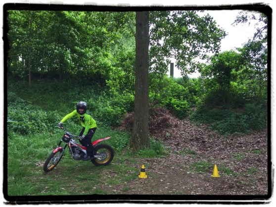 Na die eerste korte kennismaking kregen we een reeks oefeningen voorgeschoteld om de trialmotor beter te leren beheersen en ons de basistrialtechniek bij te brengen. Achtjes draaien, tussen pionnen slalommen, zo traag mogelijk rijden. Klinkt als je rijexamen? Daar leek het een beetje op, maar toch was het helemaal anders. De achtjes waren bijvoorbeeld een pak kleiner en niet op een proper stuk asfalt, maar op een hobbelig, hellend stukje gras of tussen een paar bomen die smeekten om er eens tegenaan te schurken. Qua moeilijkheidsgraad toch even iets anders.